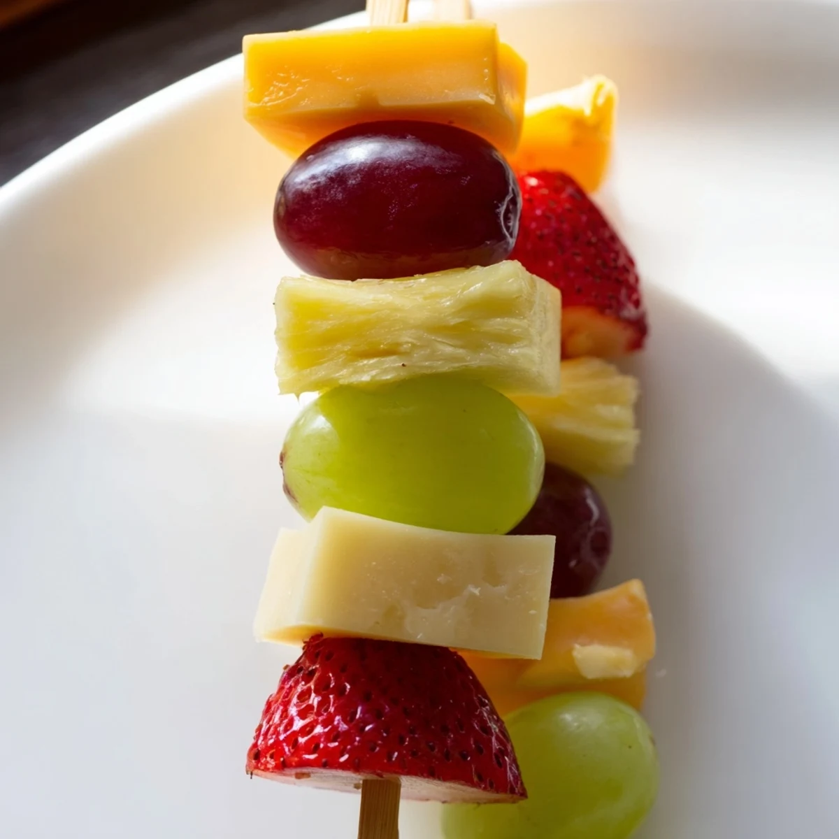Cantaloupe, honeydew melon, kiwi, apple slices, and berries all complement the cheese beautifully. If using apples, dip them briefly in lemon juice to prevent browning. Firm fruits hold up best on skewers.
