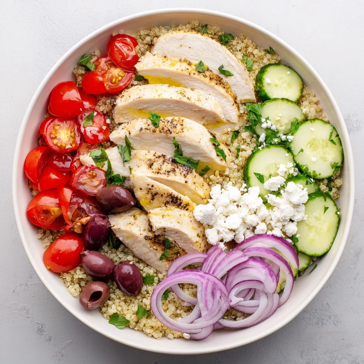 This wholesome bowl combines juicy spiced chicken with protein-rich quinoa and fresh vegetables. The Mediterranean-inspired dressing ties everything together with bright lemon and herbs.