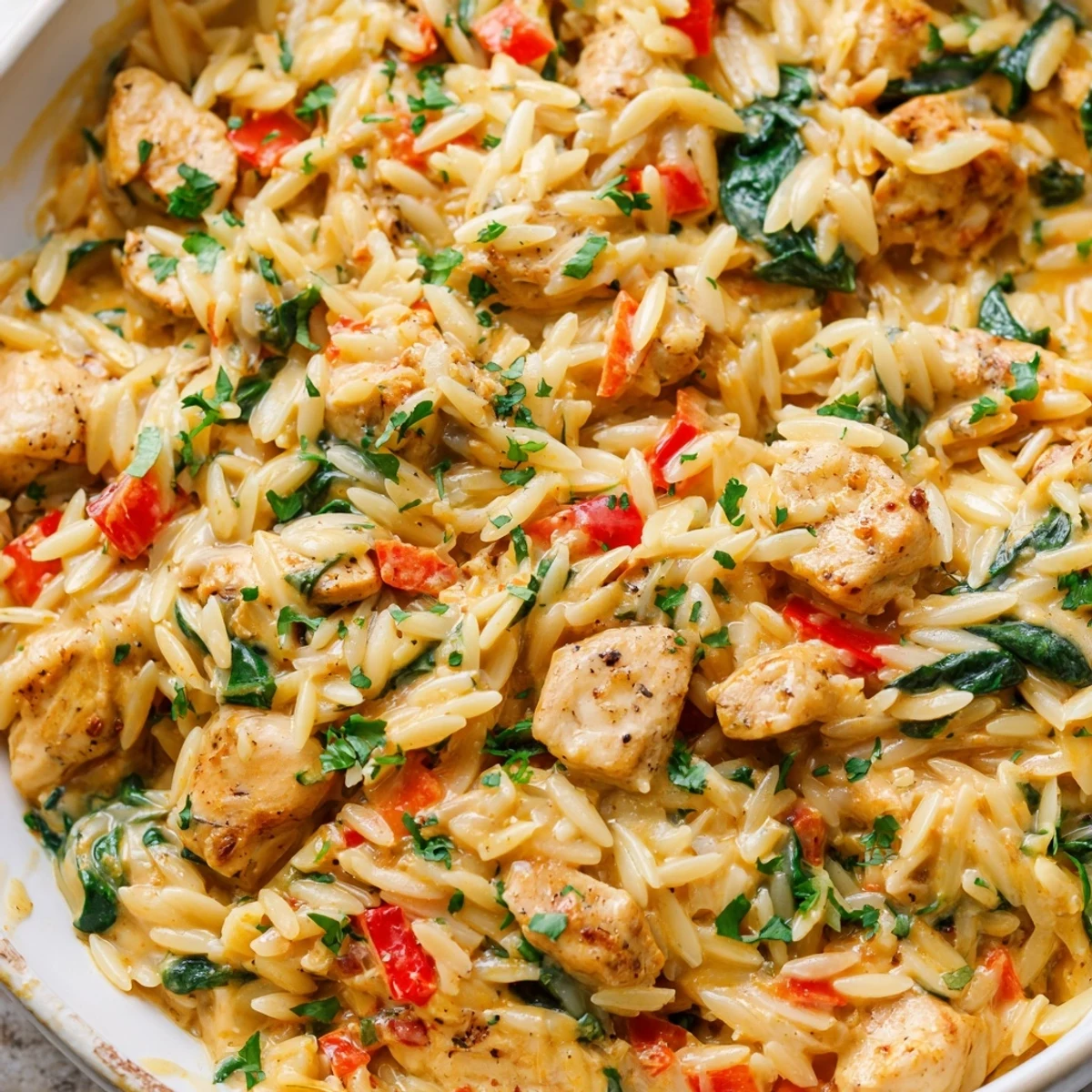 You can season and dice the chicken, chop vegetables, and measure ingredients in advance. However, cook just before serving for the best texture—the sauce thickens as it sits and the orzo absorbs more liquid. Reheat gently with a splash of cream if needed.