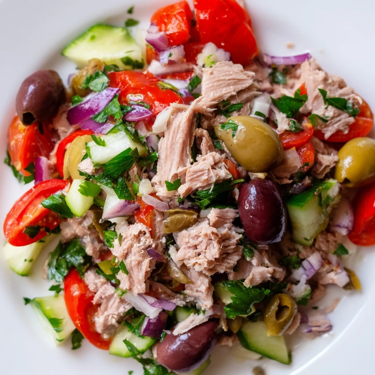 This vibrant Mediterranean-inspired tuna salad comes together in just 15 minutes with no cooking required. The combination of olive oil-packed tuna, crisp cherry tomatoes, refreshing cucumber, and tangy roasted red peppers creates a perfect balance of textures and flavors.